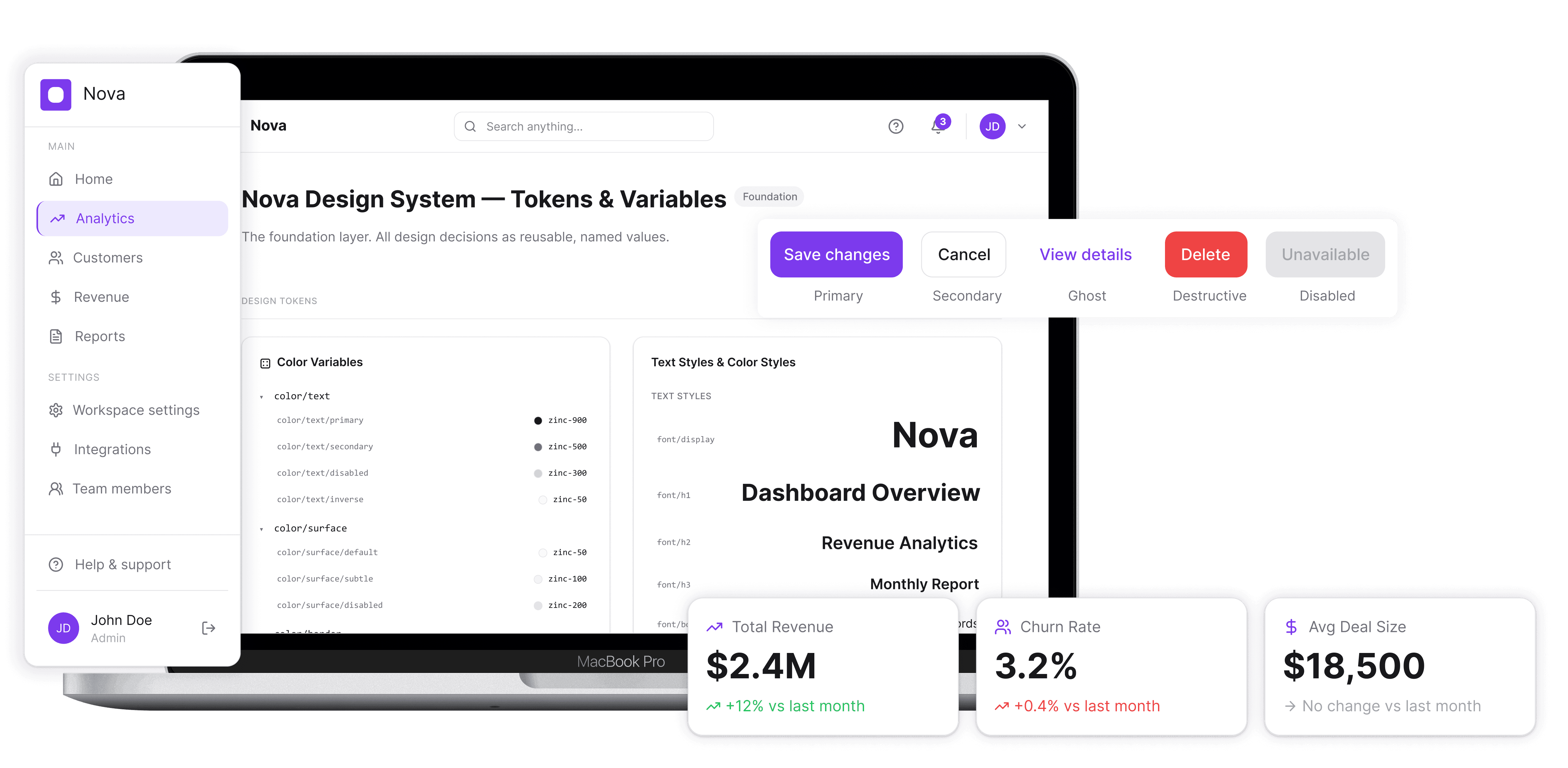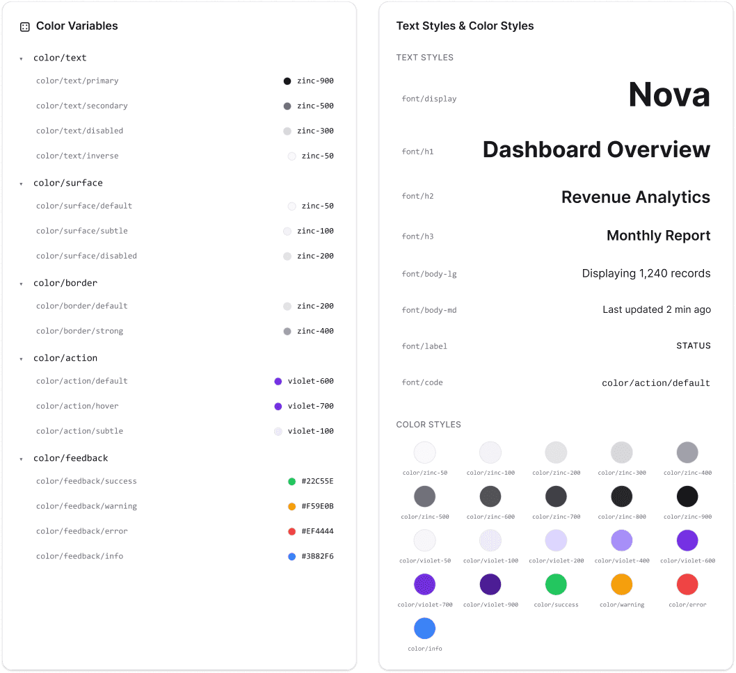 I defined all design decisions as named variables: colors, spacing, radius and shadows, so every component references a single source of truth. Changing one token updates the entire system.