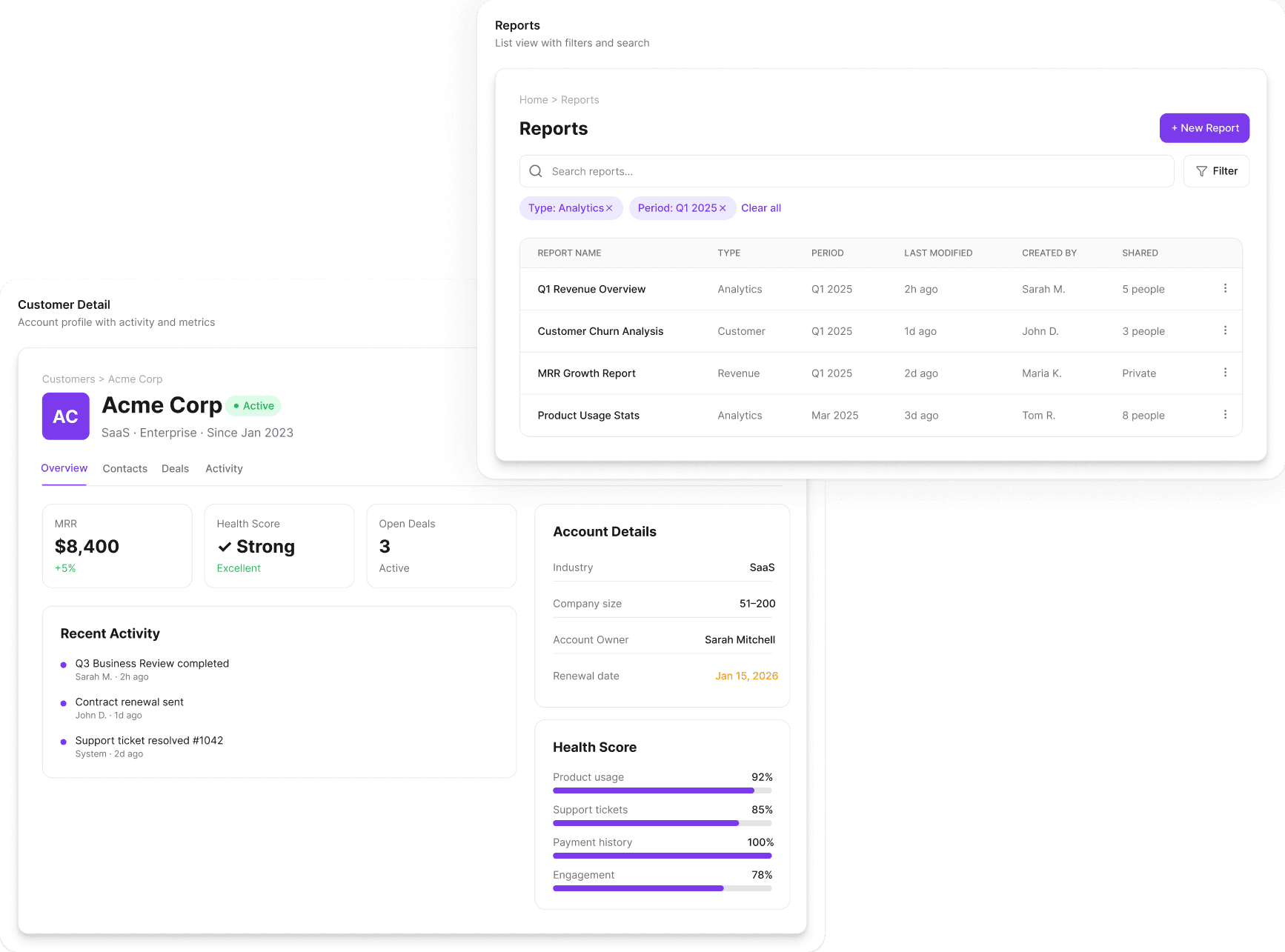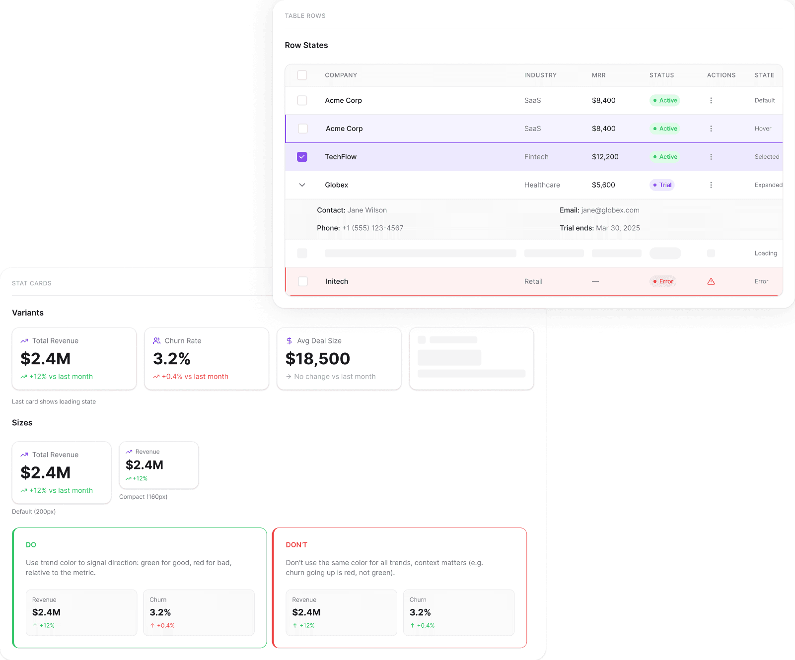 I combined atoms into functional units that solve recurring UI problems — stat cards for data density, empty states for zero-data moments, date pickers and pagination for table interactions.