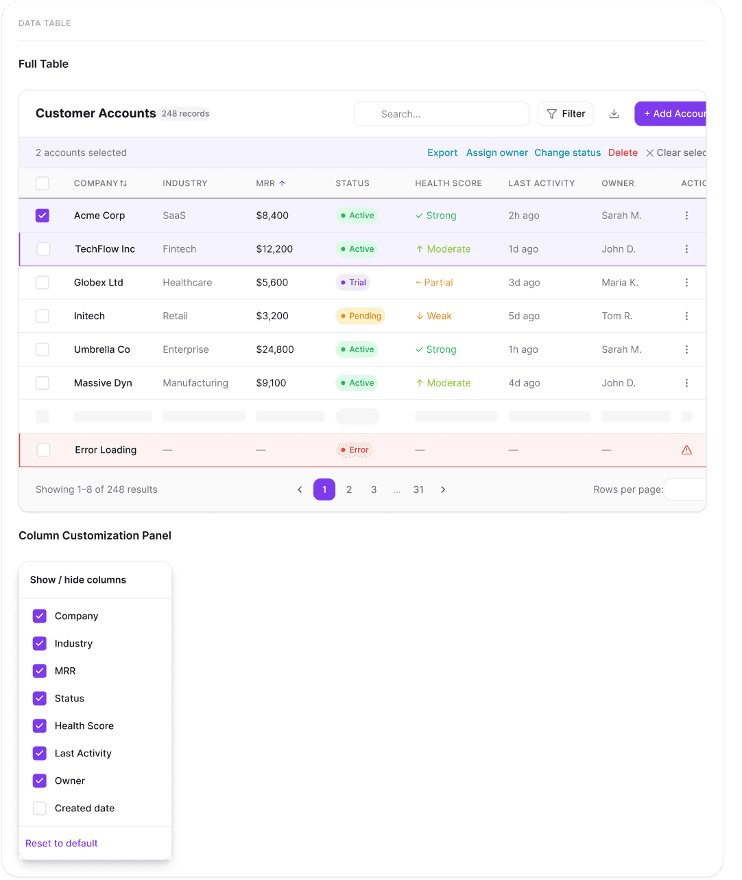 I assembled production-ready complex components: a full data table with sorting, bulk actions, and column customization; a filter panel; navigation; and modals. These drop directly into any page.